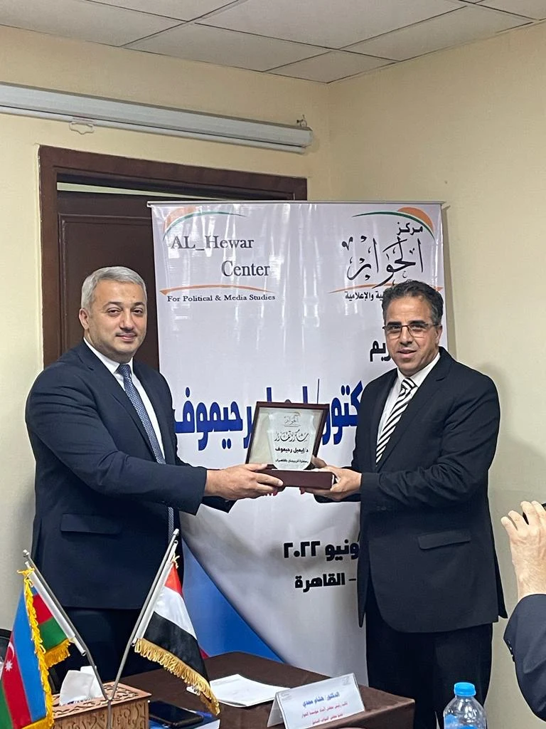 كرم مركز الحوار للدراسات السياسية والإعلامية الدكتور إيميل رحيموف المستشار الثقافي لسفارة أذربيجان بالقاهرة بمناسبة انتهاء فترة عمله في مصر، وسلم الدكتور هشام مجدي نائب رئيس مجلس أمناء مؤسسة الحوار درع المركز وشهادة شكر وتقدير للدكتور إيميل تقديرًا لجهوده وإسهاماته في تعزيز العلاقات المصرية الأذربيجانية طيلة فترة عمله في مصر.