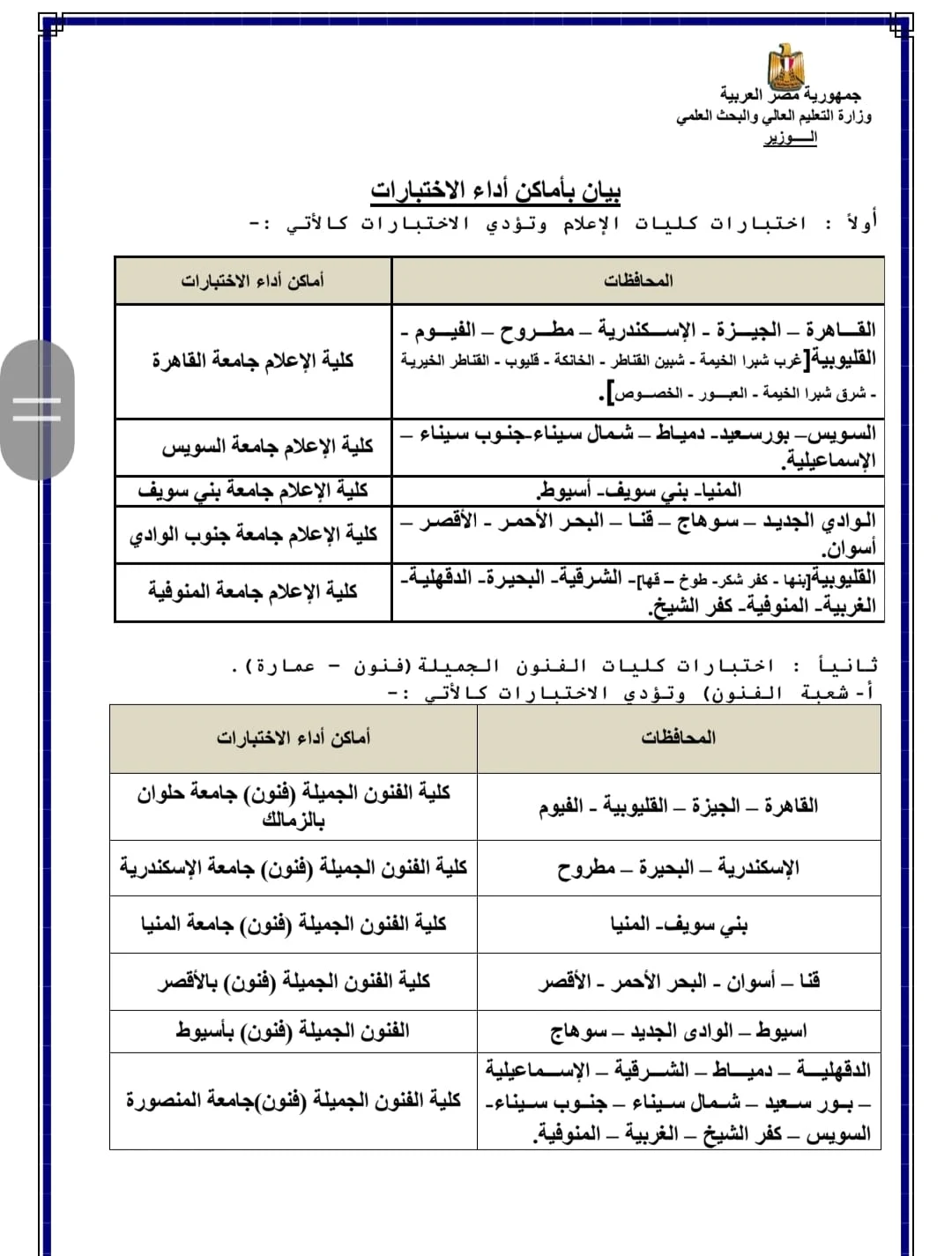 والكليات التى يشترط فيها القبول اجتياز اختبارات القدرات موضحة بالجدول الاتى هنا...