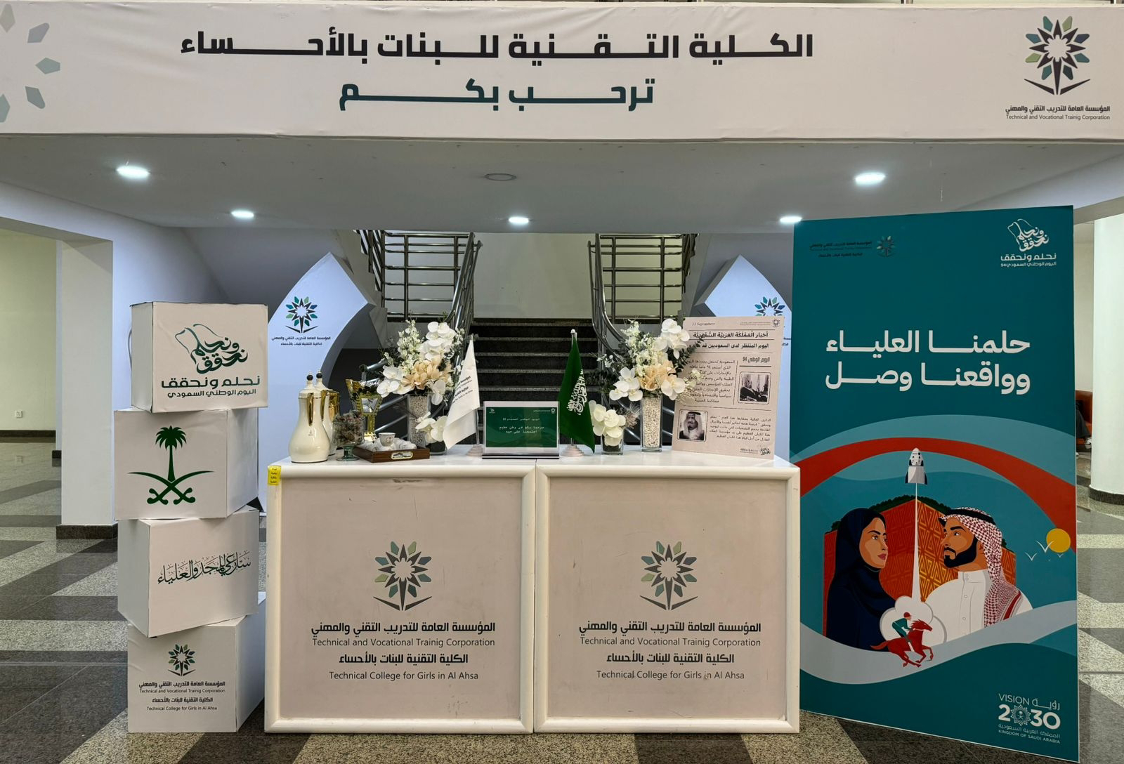 شهدت الكلية التقنية للبنات بالأحساء اسبوعاً حافلاً يضم فعاليات متنوعة للاحتفاء باليوم الوطني السعودي ال 94 تحت شعار “نحلم ونحقق” لتعزيز الانتماء للوطن والاعتزاز به و لإحياء ذكرى توحيد المملكة العربية السعودية على يد الملك عبدالعزيز آل سعود ، ضمت خلالها مجموعة من الأعمال التطوعية ضمن مبادرة لك ياوطني التي اطلقتها الإدارة العامة للتدريب التقني والمهني والتي شاركت بها الكلية بورش تطوعية وزيارة لمركز التأهيل الشامل وزيارة جمعية تفاؤل لمرضى السرطان . كما ضمت الفعاليات أركان تفاعلية ومسابقات وأنشطة مجتمعية. وقد أعربت عميدة الكلية الأستاذة سارة الصرعاوي عن اعتزاز منسوباتها بهذه المناسبة التي تجسد قيم الولاء والانتماء للوطن في ظل قيادته الرشيدة كما اشادت بإنجازات بلادنا العظيمة بكافة المجالات، مؤكدةً الإصرار على المشاركة لمواصلة مسيرة البلاد نحو التقدم والازدهار بخطوات حثيثة وجادة لتحقيق رؤية المملكة 2030. هذا وقد تضمنت الفعاليات إقامة حفل زاخر بفقرات متنوعة بدا بالسلام الملكي و كلمة افتتاحية عن حب الوطن ومن ثم أدت الفرقة الكشفية تحية العلم وأوبريت (هامة طويق) جاء بعدها القاء القصائد الوطنية و عرض فيديو لك يا وطني للمنسوبات يعبرن فيه عن امتنانهم وحبهم للوطن ، ثم فقرة الاسئلة والمعلومات الثقافية بعنوان (مشاريع المملكة العربية السعودية ل رؤية 2030 )و(ربوع بلادي )،. كما شهد الحفل حضوراً مميزاً وتفاعلاً رائعاً بالاضافة الى المشاركة في الأهازيج الوطنية ، وقد بلغ عدد الحاضرات أكثر من 350 متدربه.