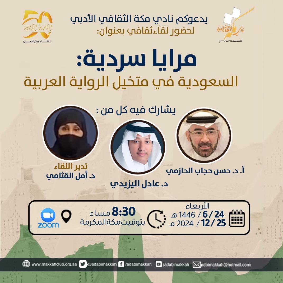 يقيم نادي مكة الثقافي الأدبي لقاءً ثقافيًا بعنوان "مرايا سردية: السعودية في متخيل الرواية العربية" عبر منصة "زووم" بمشاركة الأستاذ الدكتور حسن حجاب الحازمي والدكتور عادل اليزيدي ’ وتديره الدكتورة امل القثامي، وذلك في تمام الثامنة والنصف من مساء اليوم الأربعاء الموافق 24 -6- 1446 25- - 202412
